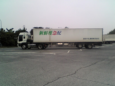 行きの高速で面白いトレーラー発見したので画像載せます よく見るとトレーラーの前側のタイヤが浮いている これリフトアクスルっていって空荷の時だけ浮かせトラクターと合わせて3軸にし高速料金を大型車で済ますもの もちろん荷物を積むと浮いてるアクスルが接地して4軸になるから料金は特大車となるわけ
