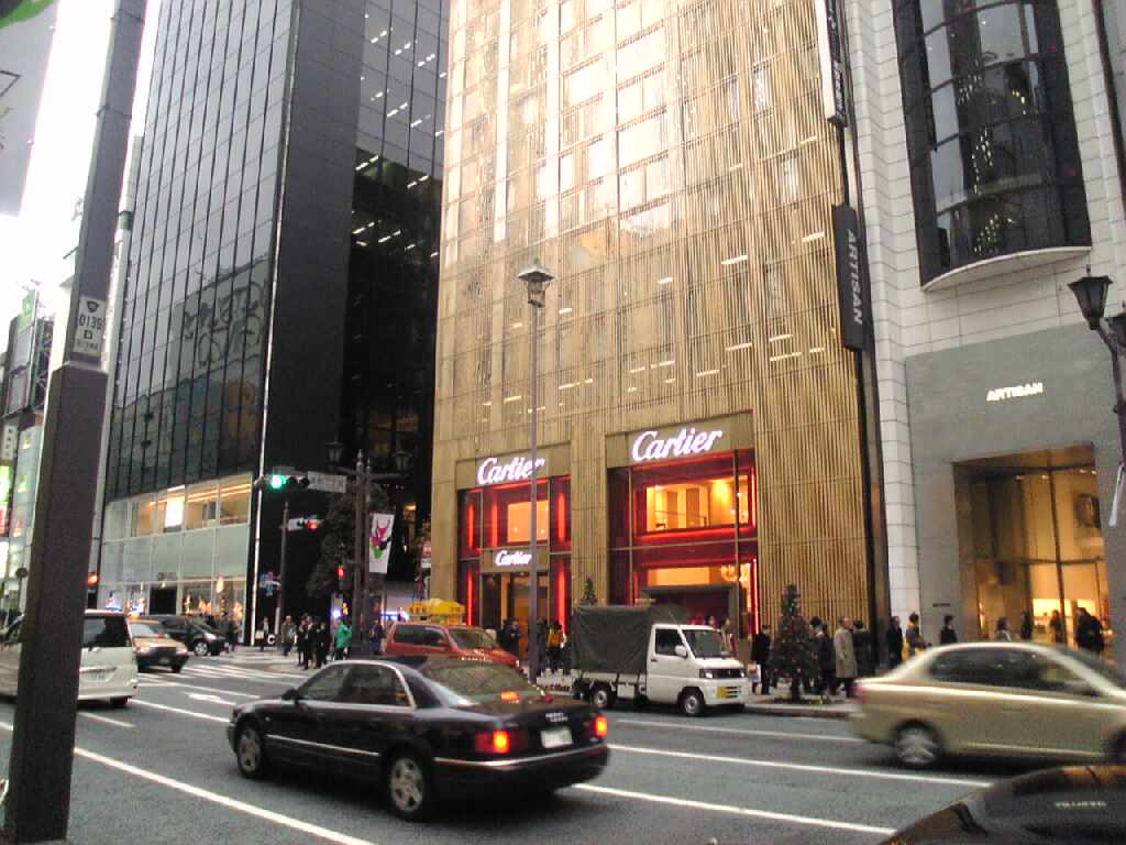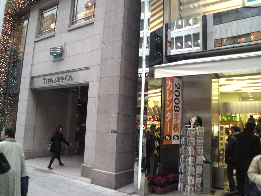 上がった所が「英国屋」で、店の前を抜けると「ティファニー」があってその隣。反対の隣は「ブルガリ」で、道路の反対側には「カルチェ」と「ダンヒル」があるからすぐに分かるよ。