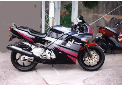 2年位バイク無し生活を送っていた俺の身体は特にバイクを欲しがる訳でもなくおとなしくしていた しかし91年だった 仕事の関係で立寄ったバイク屋で1枚のカタログを見たら一気にバイク病が再燃してしまった ホンダNSR250SE 前々からこいつが速い事は雑誌のインプレで知っていたがワークスレーサーカラーに乾式クラッチ付きときて我慢できなくなった 次にこの店に来たときにはハンコと現金を握り締めていた こいつとは1年半と1万5千キロを過ごしたがとってもいいバイクだった アルミのカラーホイールが気に入らなかったので中古の金色マグテックをつけたりもした 2サイクルと言うとガス馬鹿食いを予想していたら 信じられない程の低速トルクのおかげでおとなしく走ると20キロLに近い燃費を記録したこともあった 勿論開ければガスは食ったけど パーンと言う音と共に強力なダッシュ力を発揮してくれた しかししばらくすると自分の年齢(当時34・5歳)で乗るにはいささかこっぱずかしくなって手放した