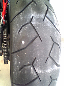 パンク修理用のプラグが無かったので、GSを飛ばしてバイクのパーツ店へ行き、帰ってすぐに修理に取り掛かった。