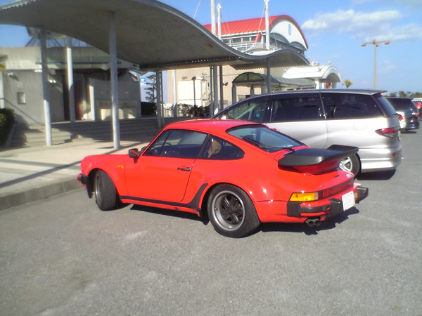 タバコをふかし、缶コーヒーを飲みながら海を見ていたら、背後で聞いた事ある「乾いた音」。振り向けば真っ赤な930ターボがPAに入ってくる。