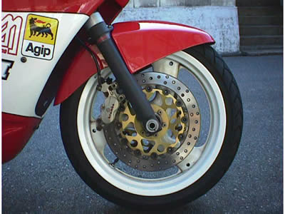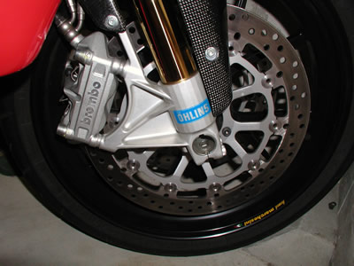 今は手放した900SS。フロントをレーシングに換装、鍛造物でダストシール無し。ローターもブレンボの鋳鉄、正に真綿を締めるフィーリングだった。今まで所有したブレンボの中で最も高級かつ強力。749Rはラジアルマウント、私には違いが分からない。