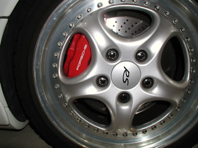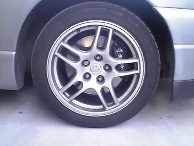 33GTRのフロントで、リアは2ポット。車重が300キロ程重たい割には、ポルシェより一回り小さいキャリパーだ。