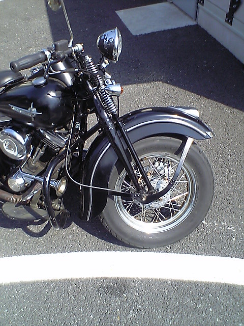 フロントは48年製のスプリンガー(本物)に換装、自分で10年以上前に塗った車体は艶のかけらも無く、リムやエキパイ蛇腹は赤錆だらけ。