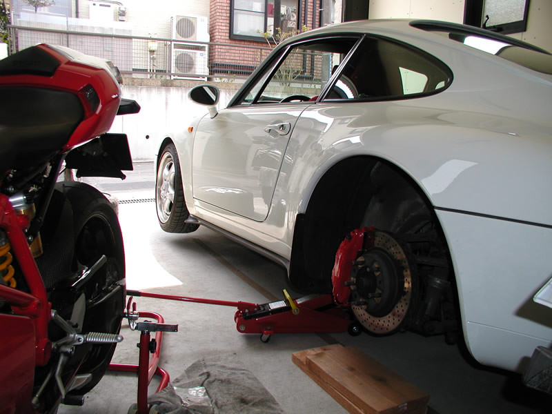 タイヤを外す際にジャッキポイントにガレージジャッキを当て持ち上げたら一緒に前輪も持ち上がってしまう。(さすがリアエンジン)