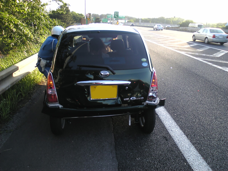 急ぎドカのレブを跳ね上げ高速を引き返すと、反対側車線から見慣れたブリティッシュグリーンのジーノ、シルバーの乗用車、そしてパトカーが並んで停車しているのが見えた。
