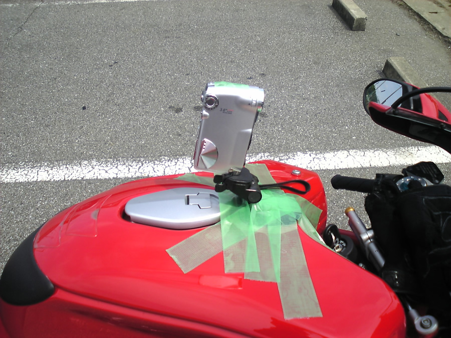 ガレージに転がっていたナビのモニター固定具にカメラを固定し早速ドカティー749Rのタンクに取り付けてみた。