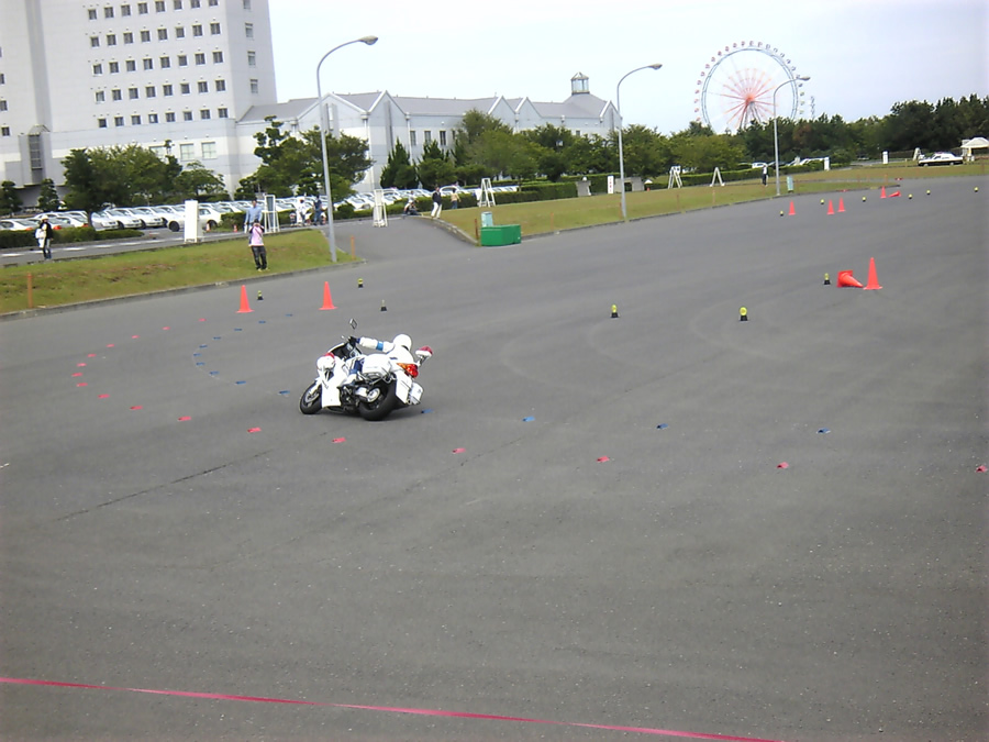 多目的広場では明日の競技であるジムカーナコースの試走が競技役員によって行われていました。競技車両は「ホンダVFR800P」。大会の華と言われるこの競技は、1速で吹け切る程のいわばハイスピードジムカーナで、フルバンクで切り返す白バイは結構な見ごたえがあります。