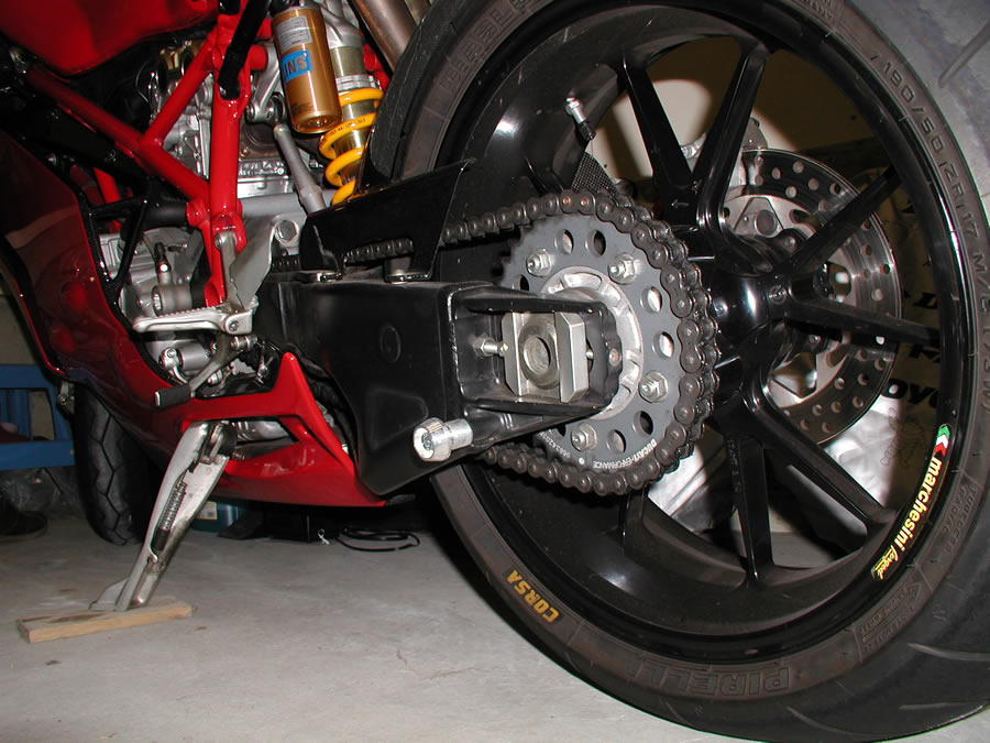 私の749Rはスプロケットを前後共交換して約10%程ショートにしています。これは元々1速から高めでクロスしたミッションを街中やワインディングで乗りやすく、かつ高いギアまで使いきれるようにという目的で行ったものですが、750ccとはいえほとんどレーシングチューンに近いエンジンパワーを持っていますから容易に吹け切ってしまうのです。