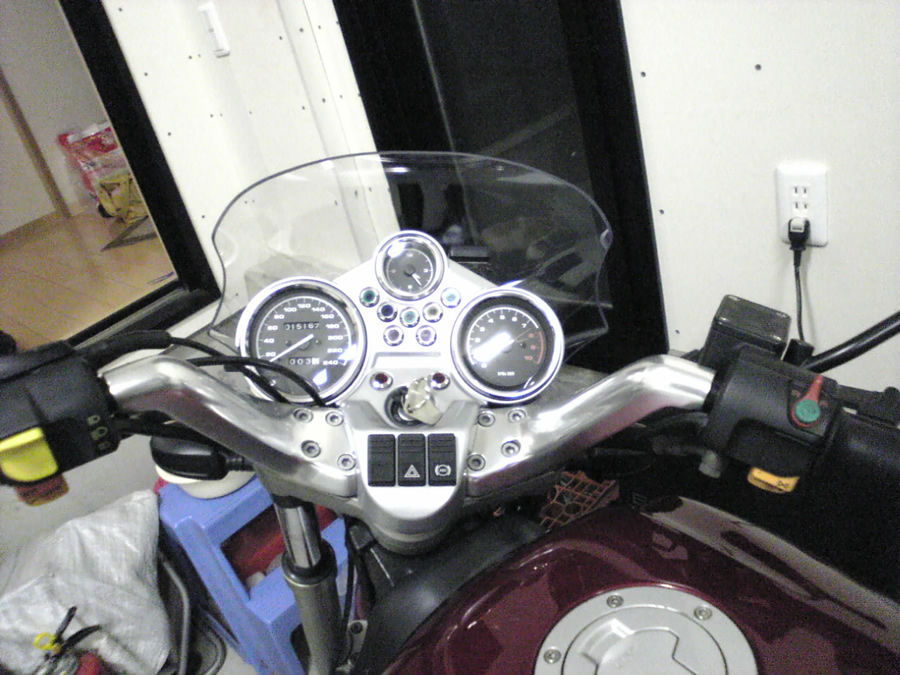 また、見た目もクリアーなスケルトンタイプで、この後期型1100Rの売り物であるメッキのメーター周りを覆い隠すことはありません。
